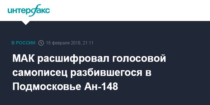 Москва. 15 февраля. INTERFAX.RU - Специалистам Межгосударственного авиационного комитета (МАК) удалось расшифровать речевой самописец разбившегося 11 февраля в Подмосковье Ан-148.