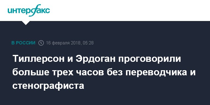 Телеканал CNN обратил внимание, что беседа Тиллерсона и Эрдогана проходила без переводчика и стенографиста. Переводчиком выступал министр иностранных дел Турции Мевлют Чавушоглу, с которым у американского дипломата состоятся официальные переговоры в пятницу.