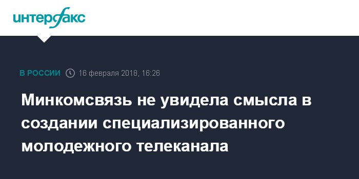 Москва. 16 февраля. INTERFAX.RU - Минкомсвязь в ближайшее время представит в правительство России заключение о нецелесообразности создания специализированного молодежного телеканала. Об этом сообщил "Интерфаксу" заместитель министра и массовых коммуникаций РФ Алексей Волин.