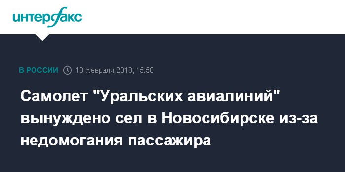Москва. 18 февраля. INTERFAX.RU - Самолет авиакомпании "Уральские авиалинии", летевший из Благовещенска в Екатеринбург, был вынужден приземлиться в Новосибирске из-за плохого самочувствия одного из пассажиров, сообщили "Интерфаксу" в пресс-службе авиакомпании.