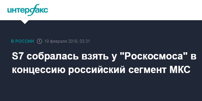 Москва. 19 февраля. INTERFAX.RU - Госкорпорация "Роскосмос" готова обсуждать передачу российского сегмента Международной космической станции (МКС) в концессию группе компаний S7, сообщает в понедельник газета "Известия".