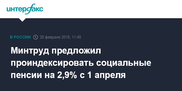 Москва. 20 февраля. INTERFAX.RU - Министерство труда и социальной защиты РФ выступило с инициативой проиндексировать социальные пенсии в России на 2,9% с 1 апреля, следует из проекта постановления правительства РФ, размещенного на портале для публикации нормативных правовых актов во вторник.
