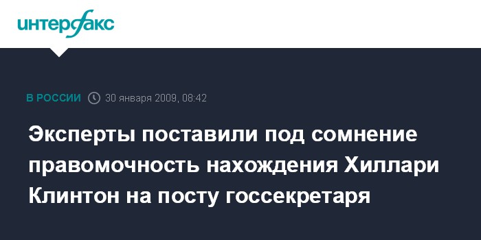 Москва. 30 января. INTERFAX.RU - Группа экспертов-консерваторов выступила с иском, в котором выражается утверждение о том, что Хиллари Клинтон не может занимать пост государственного секретаря.