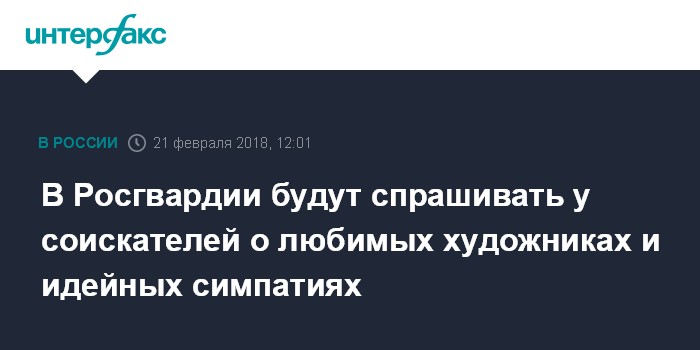 Москва. 21 февраля. INTERFAX.RU - В Росгвардии планируют выяснять любимых художников и литературные произведения претендентов на службу в ведомстве.