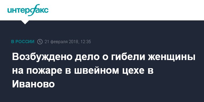 Москва. 21 февраля. INTERFAX.RU - Следователи в Иваново возбудили уголовное дело по факту гибели женщины во время пожара в производственном цехе, сообщает следственное управление СКР по региону.