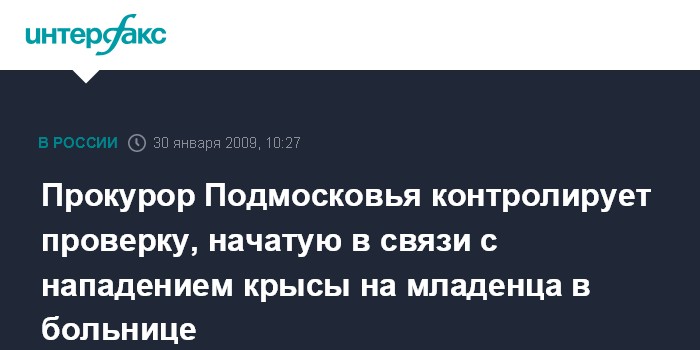 Москва. 30 января. INTERFAX.RU - В Подмосковье грудные младенцы - пациенты детской больницы стали жертвами нападения крыс. По сообщению Генеральной прокуратуры России, в минувшую среду в помещении 2-го отделения Серпуховской детской больницы двое грудных детей, находившихся на стационарном лечении в связи с тяжелой неврологической патологией, подверглись нападению крысы. Это произошло во время кормления малышей.