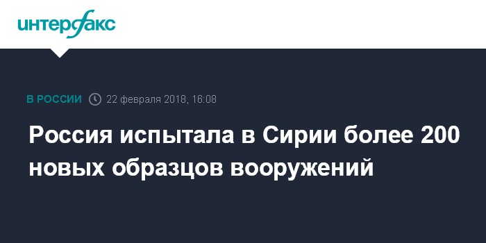 Москва. 22 февраля. INTERFAX.RU - Россия испытала в Сирии на эффективность значительный арсенал своих новых вооружений, заявил глава комитета Госдумы по обороне Владимир Шаманов.