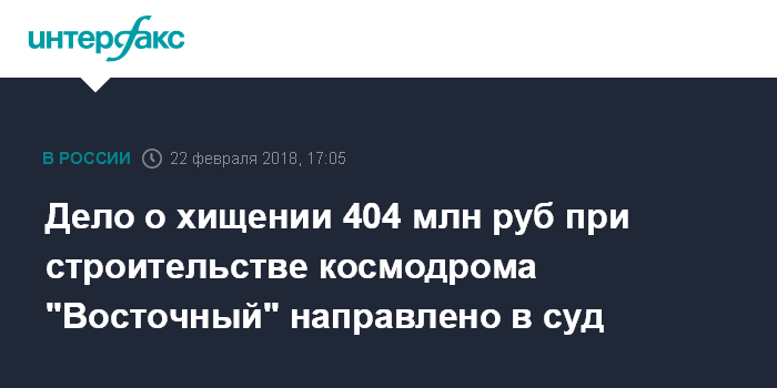 Москва. 22 февраля. INTERFAX.RU - Высокопоставленные сотрудники Спецстроя России, которые обвиняются в хищении более 400 млн рублей, выделенных на строительство космодрома Восточный, предстанут перед судом.