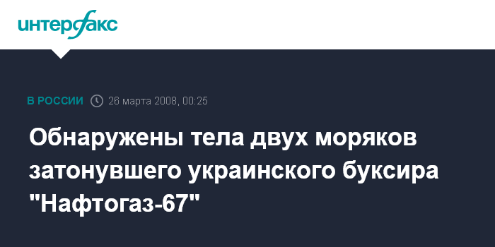 Киев. 26 марта. ИНТЕРФАКС-УКРАИНА - Обнаружены тела еще двоих моряков из числа 18 моряков числящихся пропавшими без вести после крушения украинского буксира "Нафтогаз-67" в Гонконгском проливе, сообщает телеканал "НТН" во вторник вечером.