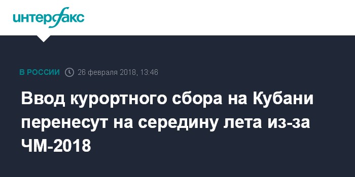 Москва. 26 февраля. INTERFAX.RU - Краснодарский край в связи с проведением чемпионата мира по футболу отложит ввод курортного сбора до середины июля, сообщил губернатор Вениамин Кондратьев.