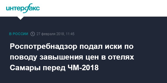 Москва. 27 февраля. INTERFAX.RU - Роспотребнадзор направил в суд иски о защите прав потребителей по фактам завышения цен в самарских гостиницах от 3% до 344% в период проведения Чемпионата мира по футболу, сообщили "Интерфаксу" в пресс-службе ведомства.