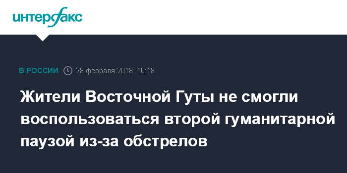 Министр обороны РФ Сергей Шойгу заявил в понедельник, что по поручению президента России Владимира Путина в пригороде Дамаска Восточная Гута с 27 февраля вводится ежедневная гуманитарная пауза с 9:00 до 14:00 по местному времени. Первая гуманитарная пауза накануне была сорвана боевиками.