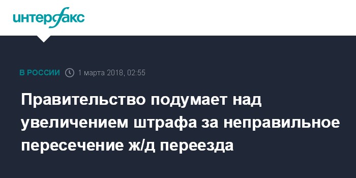 Москва. 1 марта. INTERFAX.RU - На заседании правительства РФ в четверг будет рассмотрен проект федерального закона "О внесении изменений в статью 12.10 Кодекса Российской Федерации об административных правонарушениях", предусматривающий усиление административной ответственности за противоправные действия при пересечении железнодорожных путей.