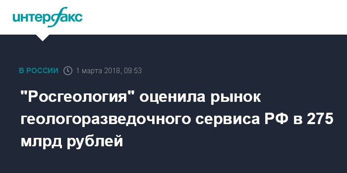 Москва. 1 марта. INTERFAX.RU - Весь рынок геологоразведочных сервисных услуг в России оценивается примерно в 275 млрд рублей без НДС, доля "Росгеологии" составляет около 13%. Такое мнение в интервью газете "Ведомости" высказал гендиректор "Росгеологии" Роман Панов.