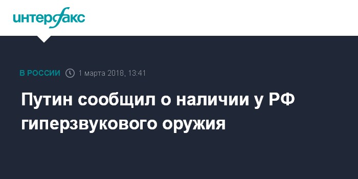 Москва. 1 марта. INTERFAX.RU - В арсенале России есть гиперзвуковое оружие, заявил президент РФ Владимир Путин в послании Федеральному Собранию.