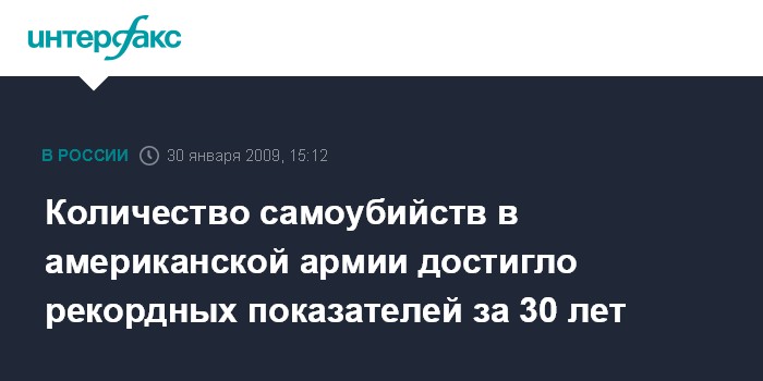 Москва. 30 января. INTERFAX.RU - Уровень самоубийств в американской армии в 2008 году достиг рекордных показателей за три десятилетия, сообщает в пятницу американская газета Los Angeles Times.