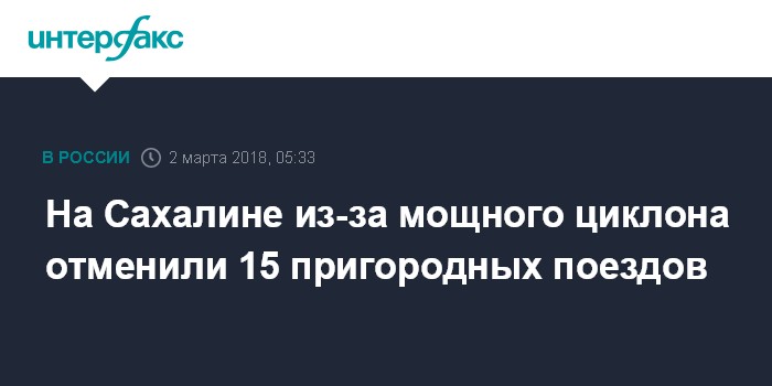 Москва. 2 марта. INTERFAX.RU - В связи с прохождением мощного циклона на юге Сахалина и западном побережье в субботу отменены 15 пригородных пассажирских поездов, сообщается в пятницу на сайте АО "Пассажирская компания "Сахалин".