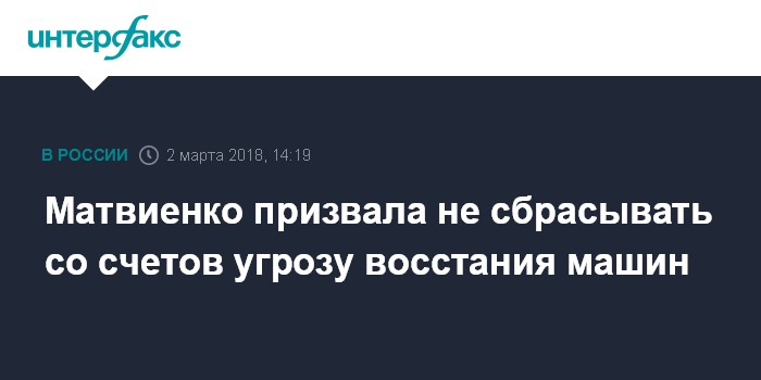 Москва. 2 марта. INTERFAX.RU - Спикер Совета Федерации Валентина Матвиенко считает, что неизбежный технический прогресс рано или поздно поставит вопрос о так называемом "восстании машин".