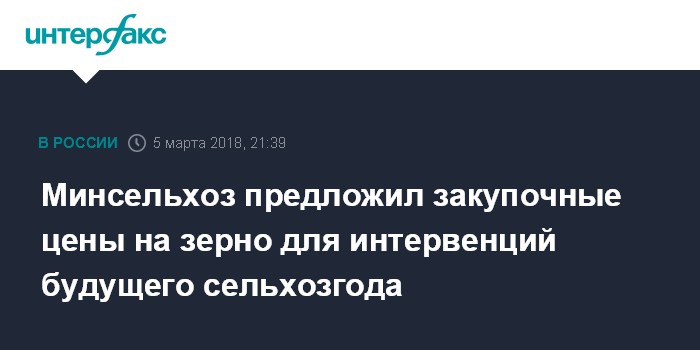 Москва. 5 марта. INTERFAX.RU - Минсельхоз РФ предложил минимальные закупочные цены на зерно, при достижении которых в будущем сельхозгоду (июль 2018-июнь 2019 гг) должны проводиться закупочные интервенции. Они ниже цен, установленных на текущий сельхозгод.