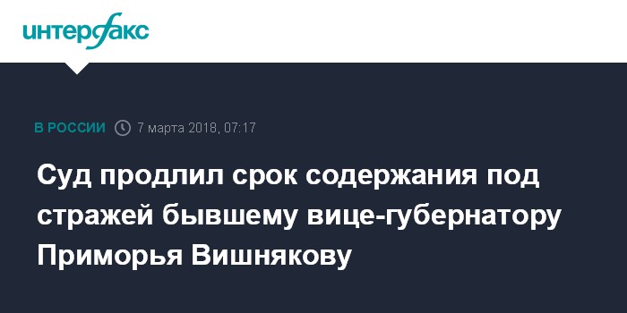 Москва. 7 марта. INTERFAX.RU - Бывший вице-губернатор Приморского края Евгений Вишняков, обвиняемый в превышении полномочий, останется под стражей до 10 мая. Срок содержания под стражей продлил Фрунзенский районный суд Владивостока по ходатайству обвинения, сообщил в среду "Интерфаксу" представитель суда.