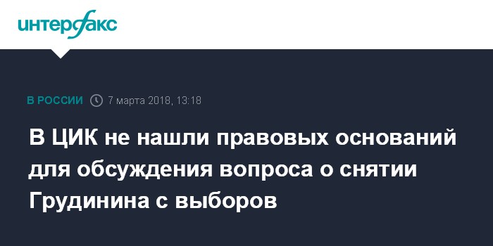 Москва. 7 марта. INTERFAX.RU - Заместитель председателя ЦИК РФ Николай Булаев заявил, что Центральная избирательная комиссия не имеет правовых оснований для рассмотрения вопроса о снятии кандидата Павла Грудинина с выборов президента РФ.