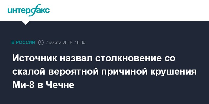 Москва. 7 марта. INTERFAX.RU - Вертолет Ми-8, разбившийся в Чечне, по предварительным данным, столкнулся со скалой в сложных метеоусловиях, сообщил "Интерфаксу" источник в штабе по ликвидации последствий ЧС на месте происшествия.