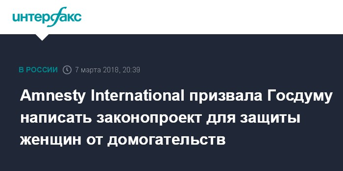 "В Amnesty International считают, что Госдума должна приступить к составлению законопроекта, который мог бы оградить женщин (...) от непристойных предложений", - заявил официальный представитель Российского офиса НКО Александр Артемьев в эфире радиостанции "Эхо Москвы".