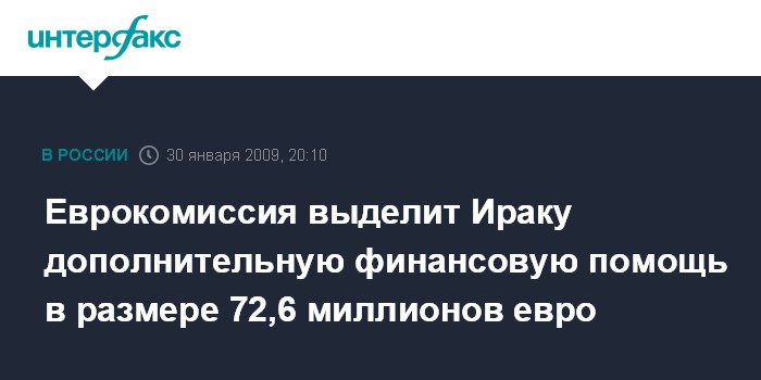Москва. 30 января. INTERFAX.RU - Европейская Комиссия (ЕК) объявила о выделении дополнительной финансовой помощи в размере 72,6 млн евро населению и властям Ирака, сообщает в пятницу агентство ЭФЭ.