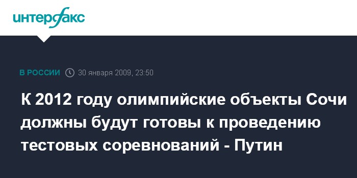 Сочи. 30 января. ИНТЕРФАКС - К 2012 году должна быть обеспечена готовность олимпийских объектов Сочи к проведению тестовых соревнований, заявил премьер-министр РФ Владимир Путин.