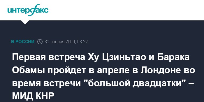 Пекин. 31 января. ИНТЕРФАКС-КИТАЙ - Первая встреча лидеров США и Китая состоится в Лондоне в апреле текущего года, сообщили в МИД КНР. В сообщении подчеркивается, что в современных условиях Китай выступает за более тесное сотрудничество с Соединенными Штатами в деле поиска путей выхода из нынешнего финансово-экономического кризиса.