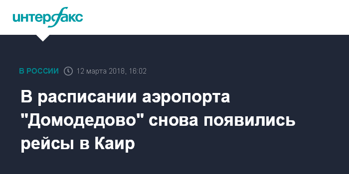 Москва. 12 марта. INTERFAX.RU - Рейсы в Каир египетской авиакомпании Egypt Air появились в расписании московского аэропорта "Домодедово" с 22 марта.