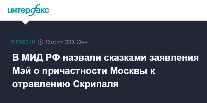 Москва. 12 марта. INTERFAX.RU - В Москве считают "цирковым шоу" и "сказками" заявления премьер-министра Великобритании Терезы Мэй о вероятной причастности России к отравлению экс-сотрудника ГРУ Сергея Скрипаля, заявила в понедельник официальный представитель МИД РФ Мария Захарова.