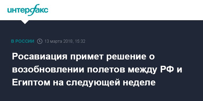 Он также отметил, что в ближайшее время "Аэрофлот" и Egyptair получат разрешения на полеты, но "сроки возобновления авиасообщения зависят от самих компаний". По его словам, компании смогут возобновить полеты между Россией и Египтом в апреле.