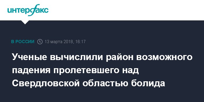 Ранее сообщалось, что болид пролетел над Свердловской областью вечером 6 марта. В соцсетях появилось несколько видео, на которых около 23:00 по местному времени (21:00 мск) запечатлено яркое свечение в небе над Екатеринбургом и Каменском-Уральским. Пользователи писали, что вспышка была похожа на молнию.