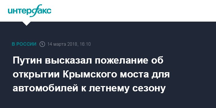 Москва. 14 марта. INTERFAX.RU - Президент РФ Владимир Путин высказал пожелание, чтобы автосообщение через Крымский мост было пущено уже к этому летнему сезону.