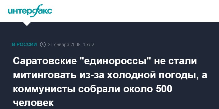 Москва. 31 января. INTERFAX.RU - В Саратове в связи с похолоданием перенесли на неопределенный срок митинг в рамках всероссийской акции в поддержку антикризисных мер, предложенных руководством России, сообщает пресс-служба саратовского регионального отделения партии "Единая Россия".