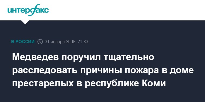 Москва. 31 января. ИНТЕРФАКС - Президент РФ Дмитрий Медведев отдал поручение провести тщательное расследование причин пожара в доме престарелых в Республике Коми и доложить ему о результатах, сообщила "Интерфаксу" в субботу пресс-секретарь главы государства Наталья Тимакова.