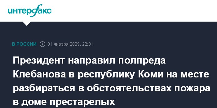 Москва. 31 января. ИНТЕРФАКС - Президент РФ Дмитрий Медведев поручил своему полномочному представителю в Северо-Западном федеральном округе Илье Клебанову отправиться в Республику Коми, где в поселке Подъельск произошел пожар в доме престарелых.
