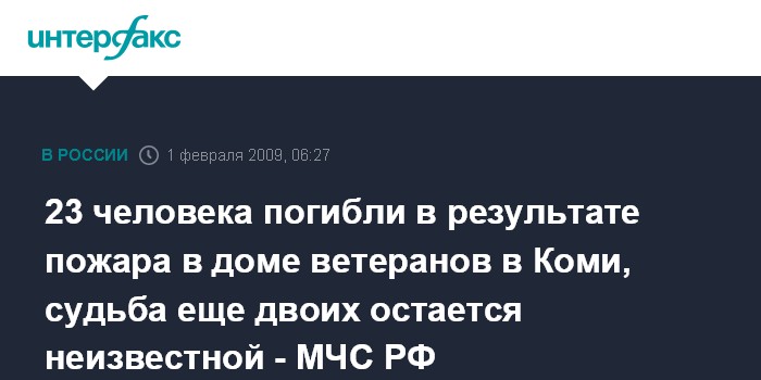 Москва. 1 февраля. ИНТЕРФАКС - 23 человека погибли в результате пожара в доме престарелых в Коми, судьба еще двоих остается неизвестной, сообщили "Интерфаксу" в МЧС России в воскресенье утром.