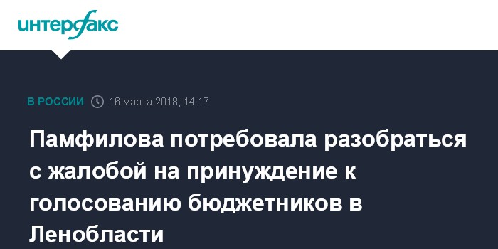 Москва. 16 марта. INTERFAX.RU - Глава ЦИК Элла Памфилова потребовала срочно обратиться в прокуратуру по поводу бюджетных организаций в Ленинградской области, в которых сотрудников принуждают голосовать, а также объявили день выборов рабочим днем с последующей оплатой.