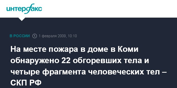 Москва. 1 февраля. INTERFAX.RU - На месте пожара в доме ветеранов в Коми обнаружено 22 обгоревших тела и четыре фрагмента человеческих тел, сообщил "Интерфаксу" официальный представитель Следственного комитета при прокуратуре (СКП) РФ Владимир Маркин.