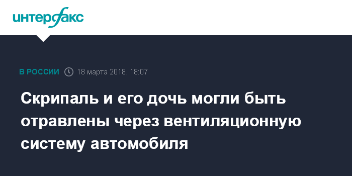 Москва. 18 марта. INTERFAX.RU - Бывший сотрудник ГРУ Сергей Скрипаль и его дочь Юлия, возможно, были отравлены через вентиляционную систему автомобиля, сообщил в воскресенье американский телеканал ABC со ссылкой на собственные источники.