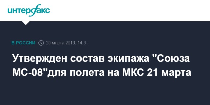 Москва. 20 марта. INTERFAX.RU - Госкомиссия на космодроме Байконур утвердила состав экипажа транспортного пилотируемого корабля "Союз МС-08", которому предстоит в среду отправиться на Международную космическую станцию (МКС), передает корреспондент "Интерфакса".