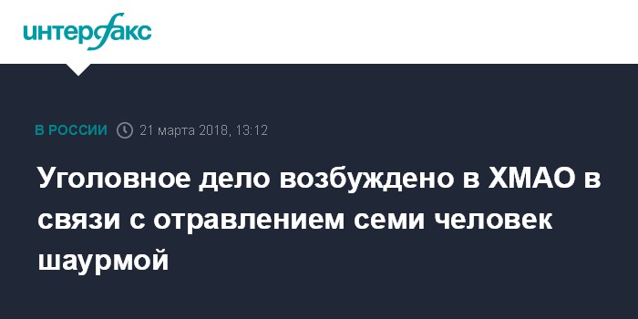 Москва. 21 марта. INTERFAX.RU - Следователи возбудили уголовное дело в связи с отравлением семи человек шаурмой в Урае (Ханты-Мансийский автономный округ), сообщается на сайте регионального следственного управления СКР.