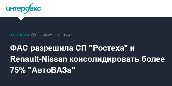Москва. 22 марта. INTERFAX.RU - Федеральная антимонопольная служба (ФАС) России удовлетворила ходатайство зарегистрированной в Голландии Alliance Rostec Auto B.V. о приобретении "более 75% голосующих акций" ПАО "АвтоВАЗ", сообщил регулятор.