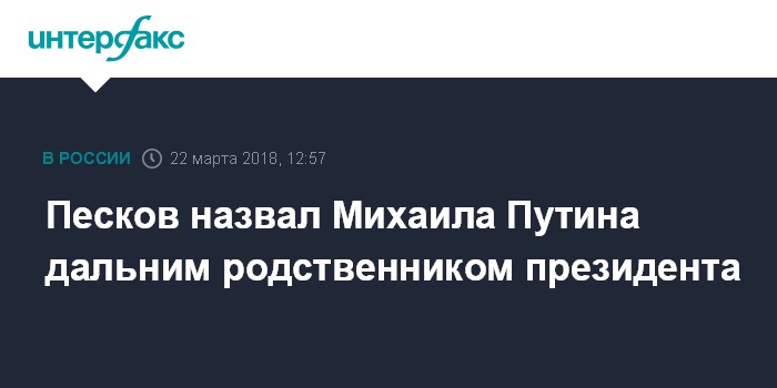 "Насколько мне известно, он действительно является дальним родственником президента. Мне не известно о том, что у них есть какое-то общение, то есть фактически они не общаются. Но какое-то дальнее родство действительно есть", - сказал Песков журналистам, отвечая на вопрос, является ли Михаил Путин родственником президента, как утверждают СМИ.