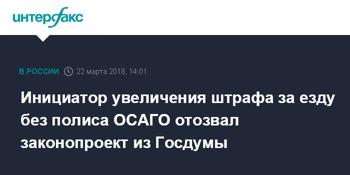Москва. 22 марта. INTERFAX.RU - Автор законопроекта об увеличении штрафов за отсутствие полиса ОСАГО до пяти тысяч рублей депутат Госдумы Сергей Вострецов отзывает свою инициативу на доработку и внесет ее уже при новом составе правительства РФ.