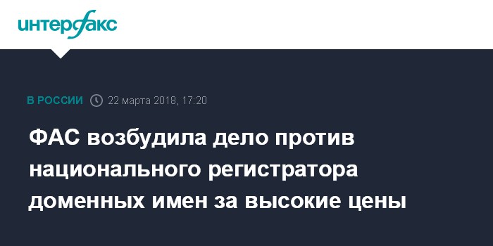 Регулятор возбудил дело по признакам нарушения пункта 1 части 1 статьи 10 Закона о защите конкуренции по заявлению аккредитованных российских регистраторов доменных имен второго уровня в зонах .RU и .РФ о необоснованном завышении цены на услуги по предоставлению доступа к реестру национальных доменов верхнего уровня (регистрация доменных имен).