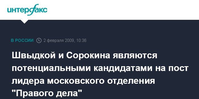 "Интерфакс" пока не располагает официальным подтверждением в партии сведений о рассмотрении кандидатур Швыдкого и Сорокиной на пост руководителя столичного отделения "Правого дела".