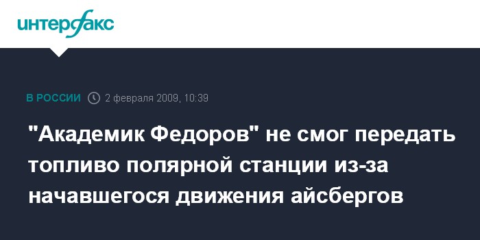 Москва. 2 февраля. INTERFAX.RU - Активный взлом льда и движение айсбергов не позволили научно-экспедиционному судну "Академик Федоров" обеспечить в полном объеме топливом российскую полярную станцию "Прогресс", сообщает в понедельник пресс-служба Арктического и Антарктического института.